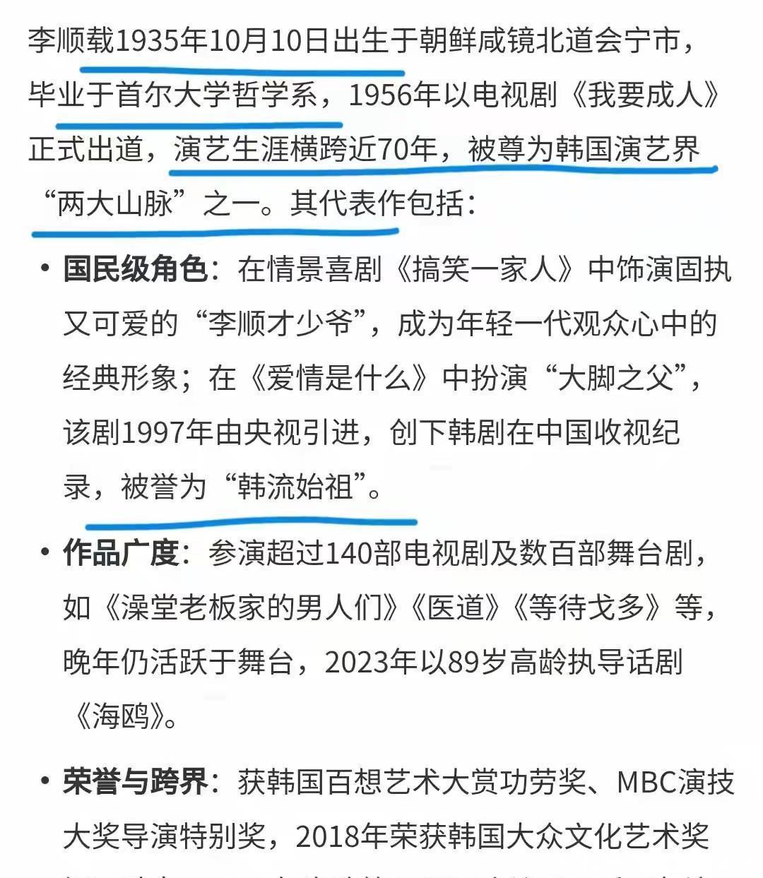 但李顺载的传奇远不止这两部剧。从《洗澡堂老板家的男人们》中慈祥的金福童,到电影《我爱你》中深情的金万皙(凭此拿下中国观众最喜爱的男演员奖);从综艺《花样爷爷》里体力超绝的旅行达人,到近90岁时挑战话剧《等待等待戈多》,他用近百部作品证明了“活到老演到老”的敬业。为了演好《贝多芬病毒》中的双簧管手,他坚持每日训练;片场遇到新人演员,他会一边背台词一边耐心指导,被郑日宇等后辈称为“片场定海神针”。作为韩国演员协会会长,他还积极推动行业权益保障,被誉为“德艺双馨的标杆”。